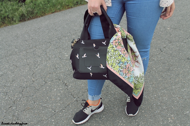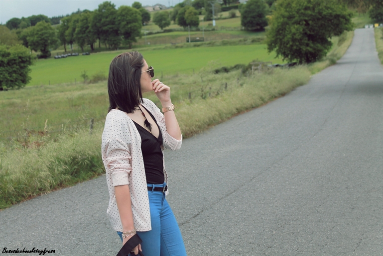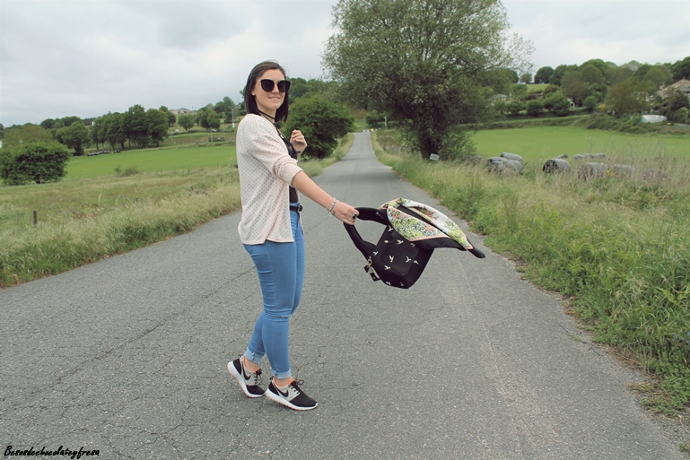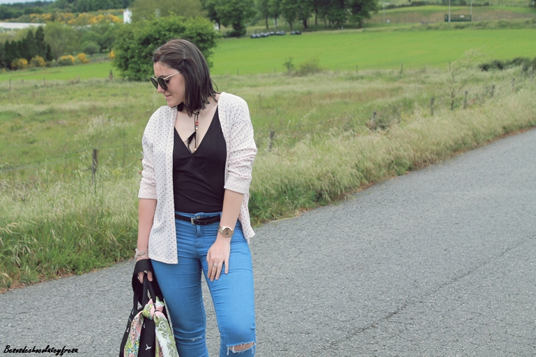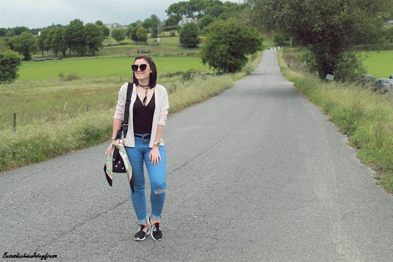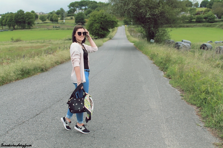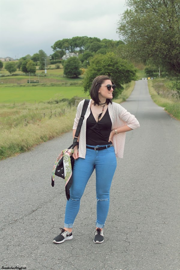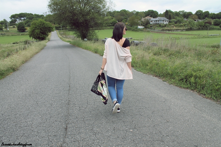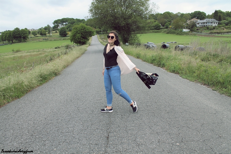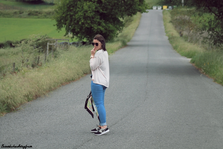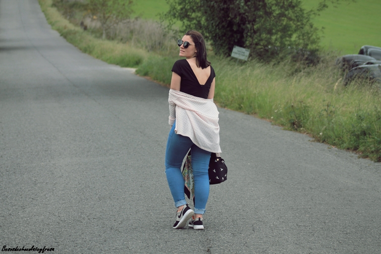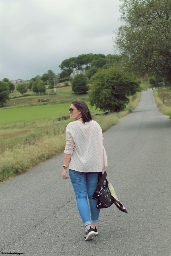 En cuanto al look llevo algo cómodo que puse este pasado domingo para una jornada de fútbol y por la tarde para pasear y hacer un poco de turismo por la ciudad. Llevo jeans claritos con rotos en las rodillas, body con escote tanto en la parte delantera como en la trasera, chaqueta en contraste oversize en rosa bebe y lunares y como complementos sneakers, choker de plumas negro y bolso del mismo color con otra forma de llevar nuestros pañuelos, atado al asa del mismo.