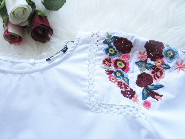 La blusa es la talla M, como veis es blanca, no muy ajustada pero tampoco gigante, con manga 3/4 con cintas, cuello redondo pero no muy pegado al cuello, bordados de flores, botoncito trasero e invisible para facilitar el ponerse la prenda, y muchos detalles que, a mi parecer, la hacen una prenda altamente versátil y muy favorecedora teniendo en cuenta la época que entra. Siempre tengo miedo al blanco, porque se ensucia mucho (si tienes críos pequeños casi que te puedes olvidar de ese color) y porque a veces transparenta demasiado...en este caso la tela es de muy buena calidad, no transparenta nada, es fácil de planchar y está bien terminada. Llevaba su etiqueta (yo la lavé en cuánto llegó y se la quité). Me queda perfecta y estoy muy contenta con mi elección. Su precio es de 18.70€ y sólo queda (por ahora) la talla M.