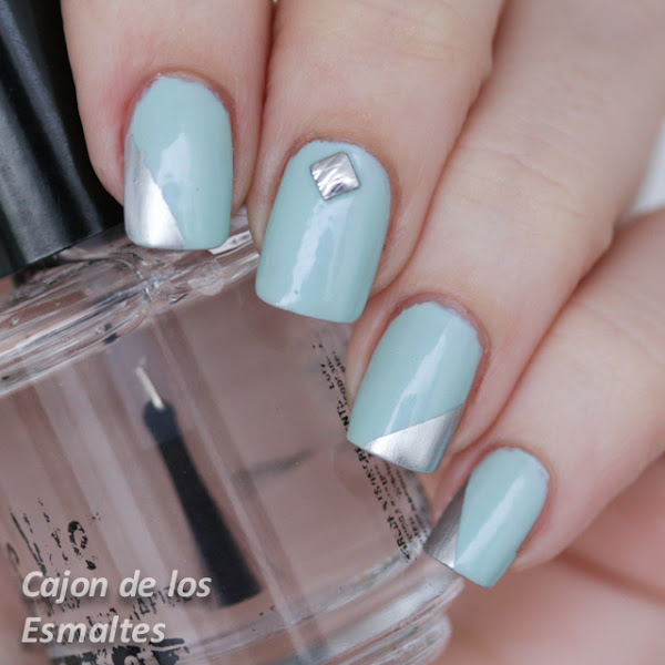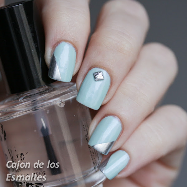 Acompañamos el esmalte con un nail art bien sencillito, tachas de la tienda BornPretty Store como siempre y el detalle en plateado no es obra de mi buen pulso sino de cinta adhesiva y el esmalte cromado No place like chrome de Essie. Siempre que usen cinta dos consejos: