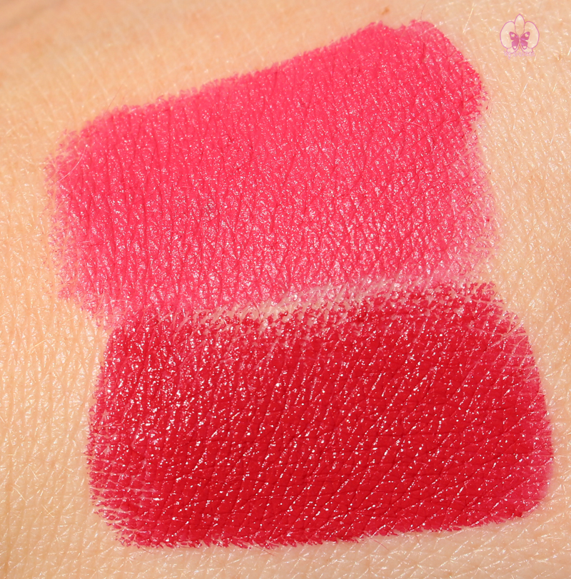 El rosa es el tono M301 de los mate y el rojo es el tono C405 de los cremosos y así es como se ven en la muestra que me hice en la palma de la mano.