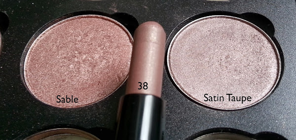 La verdad es que al poner el Longlasting 38 al lado de las sombras de M.A.C. me pareció que el color era mucho mas cercano a la sombra Sable que a Satin Taupe, aunque como veréis, en los swatches la cosa cambia.