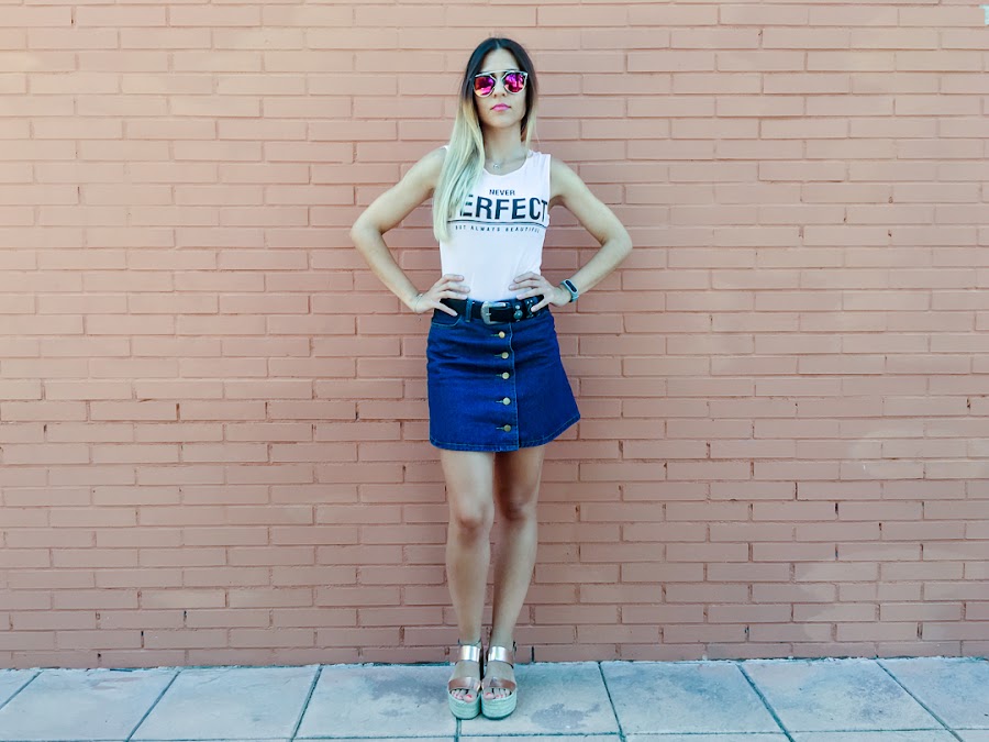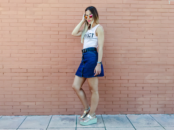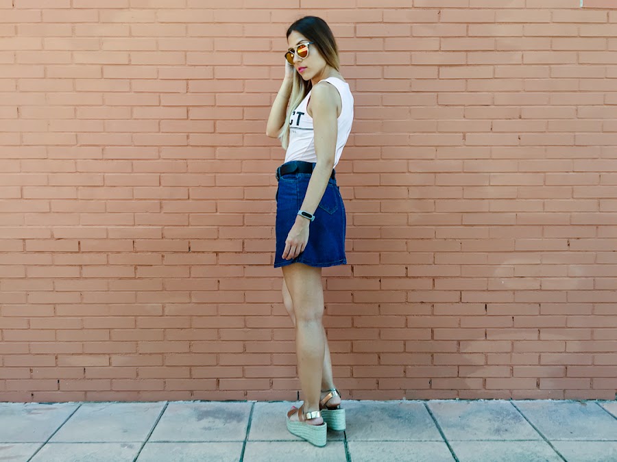 Lo he combinado con una falda vaquera en forma de A y botones delanteros y mis nuevas sandalias de plataforma de TRENDY GURU.