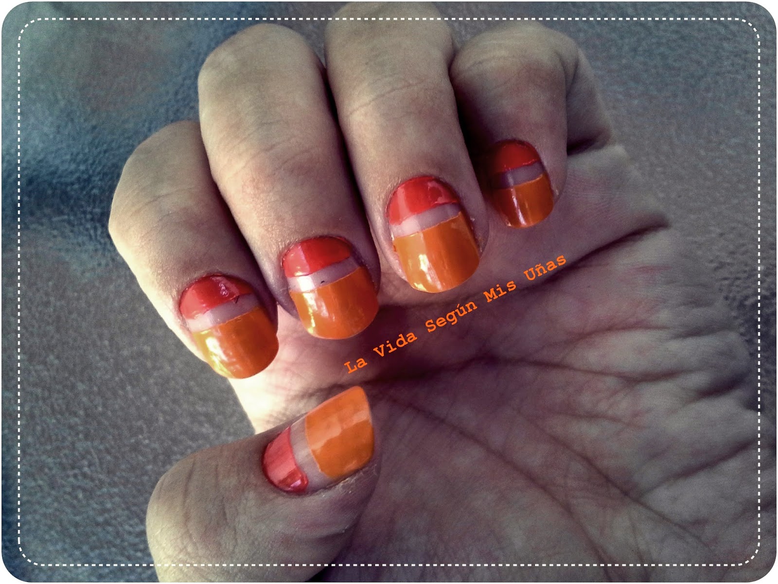 Una ves secas, con la ayuda de unas nail tapes separé las dos zonas que iba a pintar de naranja claro y oscuro. Luego pasé a dar dos capas de cada esmalte en la zona correspondiente.