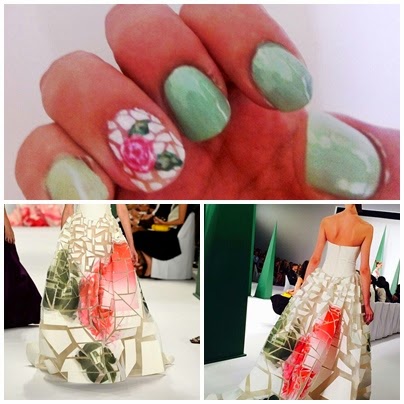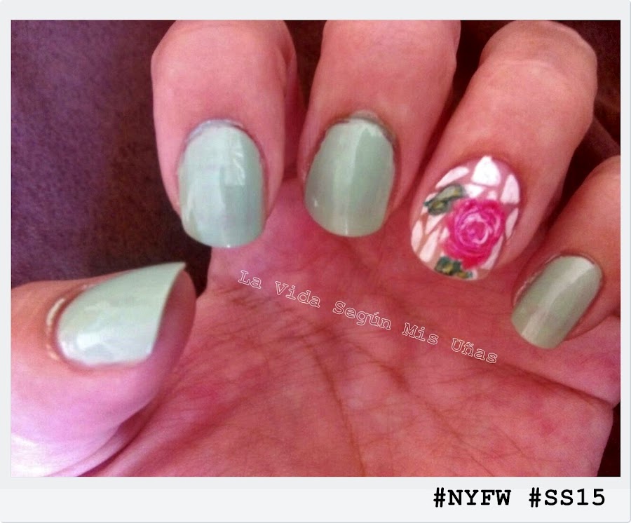Para ella, como veis en la uña del dedo anular está el mosaico que esta dibujado en el vestido con la rosa encima. Para la otras uñas, un verde menta pastel suuper bonito.