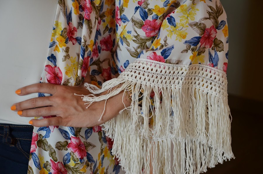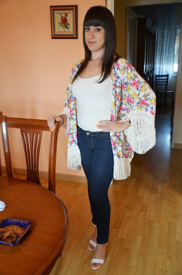 Estoy encantada con este kimono, desde la primera vez que lo vi me llamo la atención por la mezcla de colores que tiene y los flecos, que le aportan cierta gracia y elegancia a la prenda. En mi opinión los kimonos son la prenda estrella de este verano, son una prenda muy versátil y ligera para esta época del año y que la podéis encontrar con diversidad de estampados y detalles.