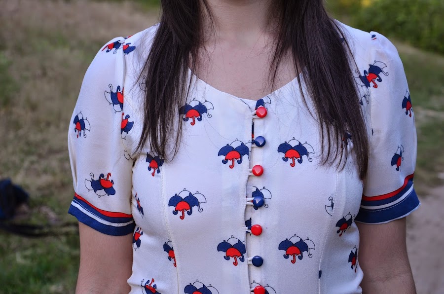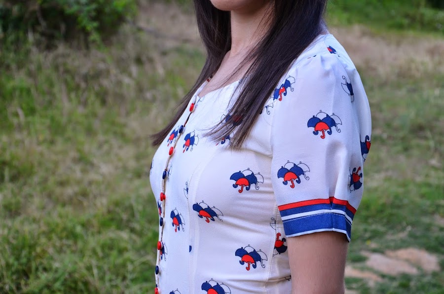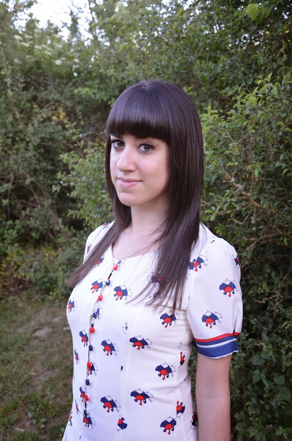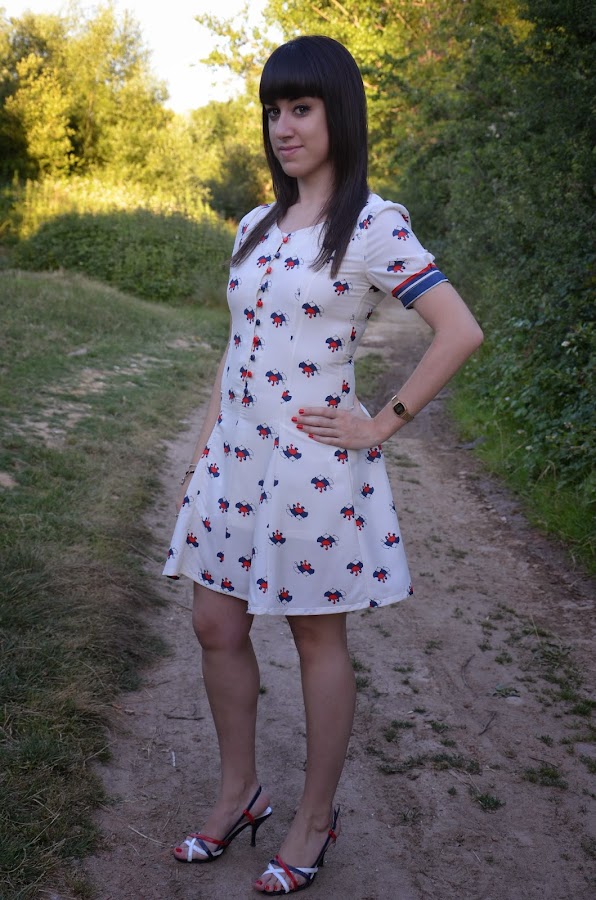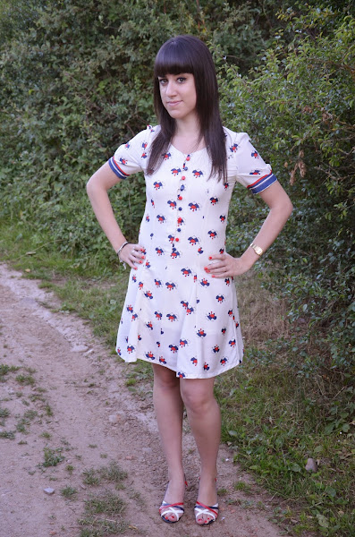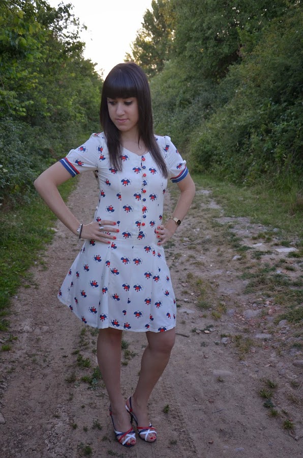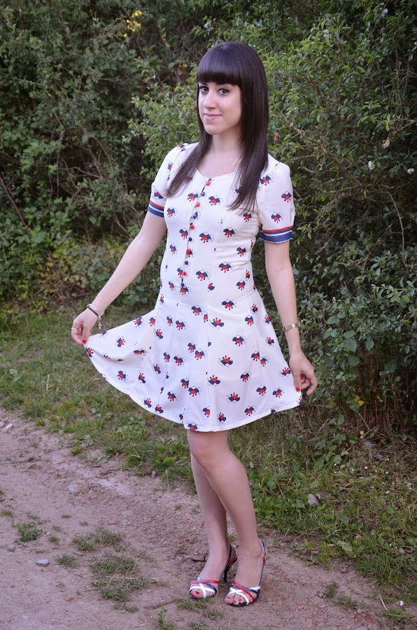 Lo que primero me llamó la atención de este vestido es la forma abotonada del escote intercalando los botones azules y rojos y las mangas abombadas, que junto con el estampado me encantó, sin embargo en contra tiene que es un vestido muy ceñido y ajustado, seguramente una talla más hubiera estado mejor por que talla un pelín justo. Para que os hagáis una idea yo pedí la talla M.
