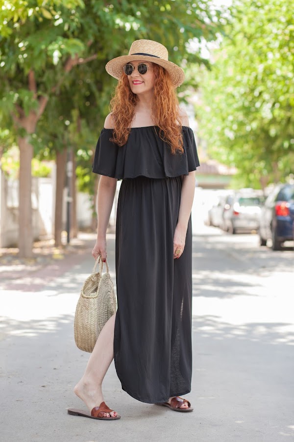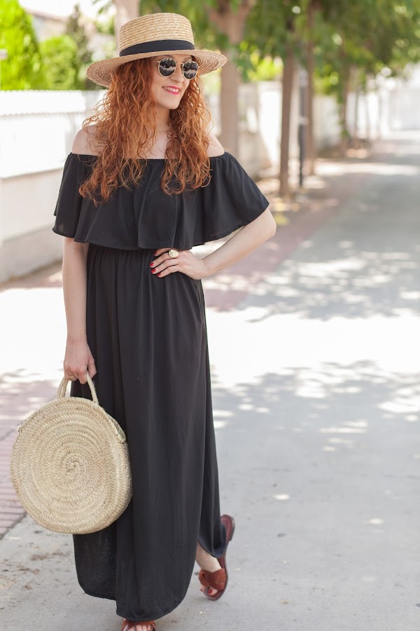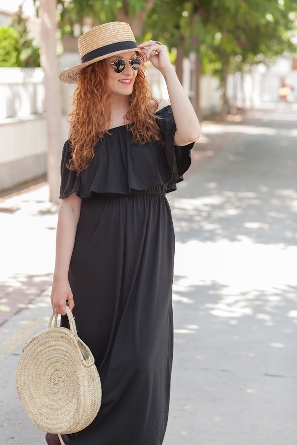 El viernes pasado recibí este precioso vestido largo con escote Bardot que aunque es muy sencillo me conquisto nada más verlo. Como es normal, al gustarme tanto me moría por estrenarlo lo antes posible, así que el sábado no lo dudé y me lo puse. Lo acompañé de un canotier, capazo redondo y sandalias planas, consiguiendo un look veraniego, cómodo y con estilo.