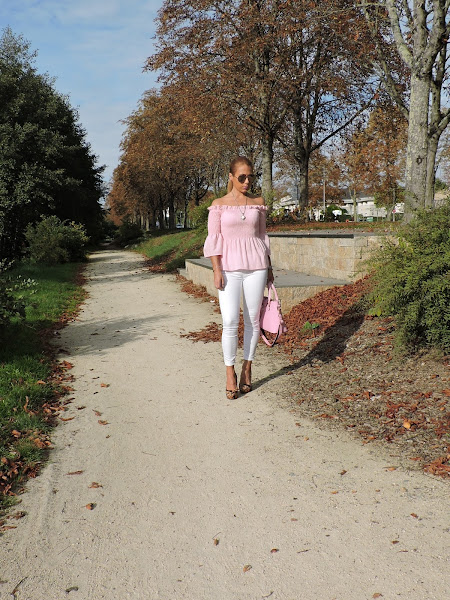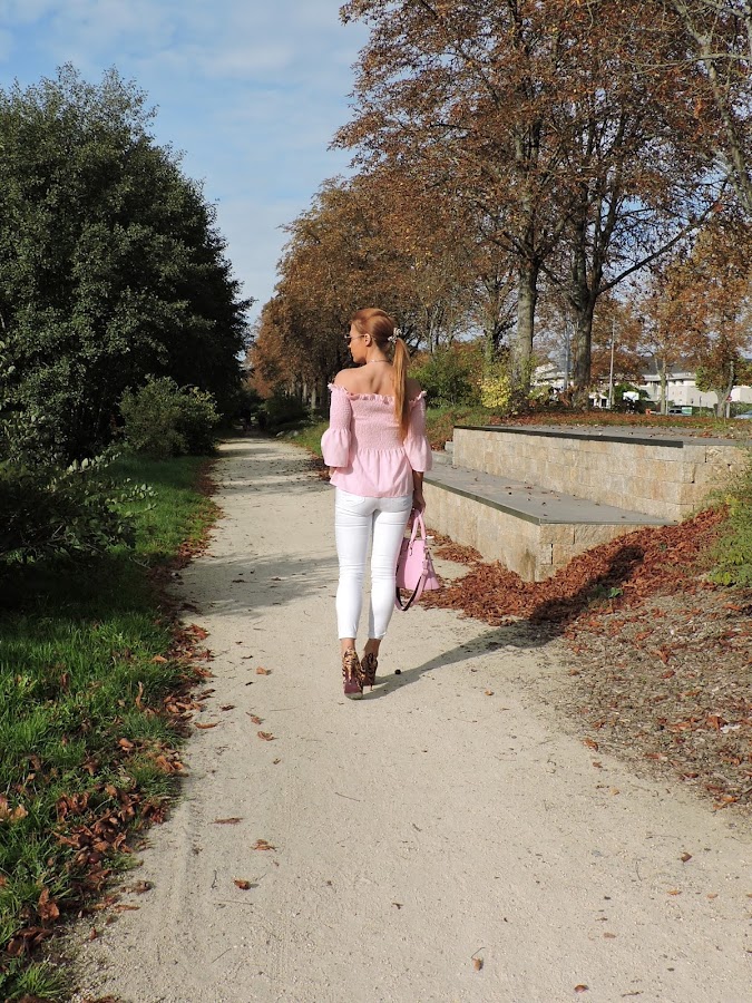 En cuanto a los accesorios (más abajo tenéis una foto donde se aprecian mejor) opte por el bolso rosa, collar plateado con una piedra blanca, pulsera vikings modelo Galatea