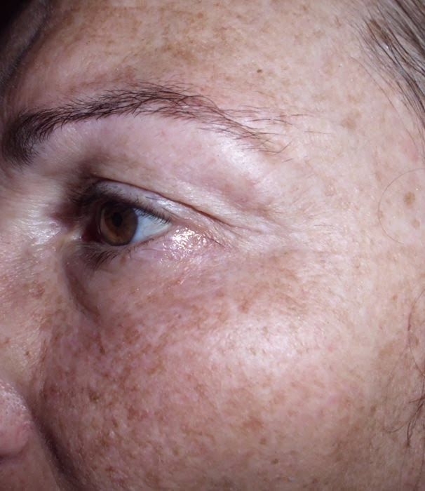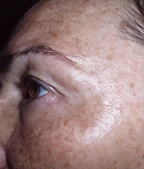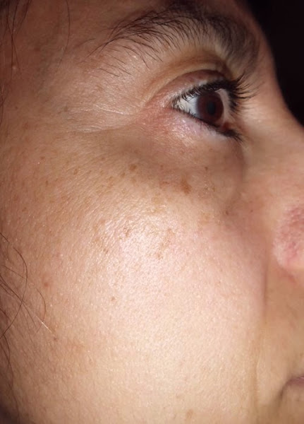 Foto tomada unas dos semanas después de la primera, la piel se ve menos oscura en general y más luminosa. El tono de las manchas es un poco menos intenso.