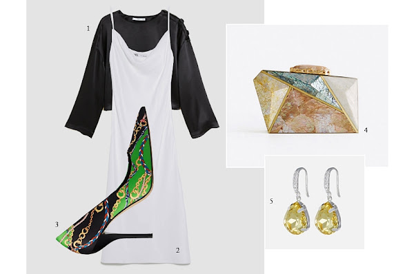 En orden numérico: Blusa satinada, Mango (29.99€) Vestido lencero, Zara (39.95€) Salones estampados, Zara (35.95€) Clutch asimétrico, Uterqüe (250.00€) Pendientes, SNÖ of Sweden (34.95€)