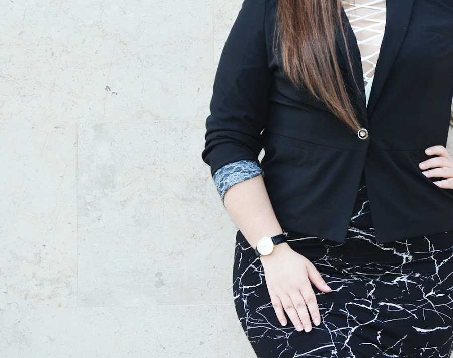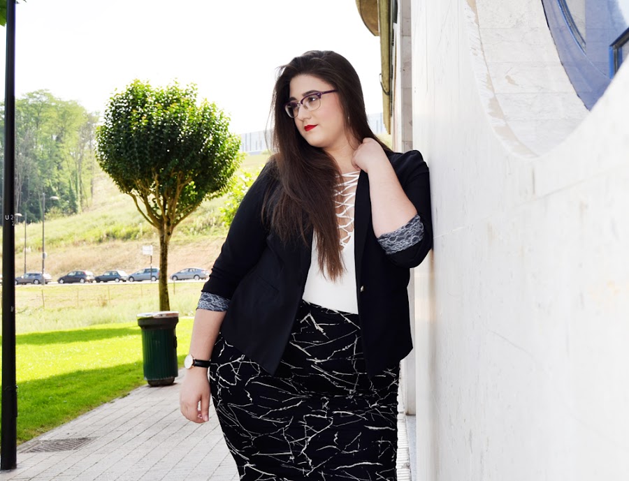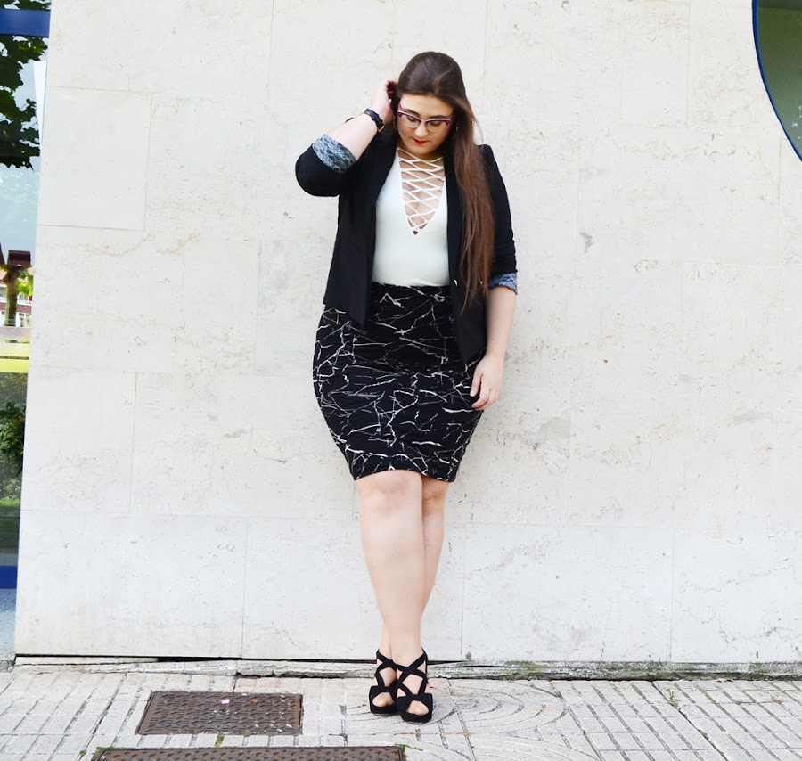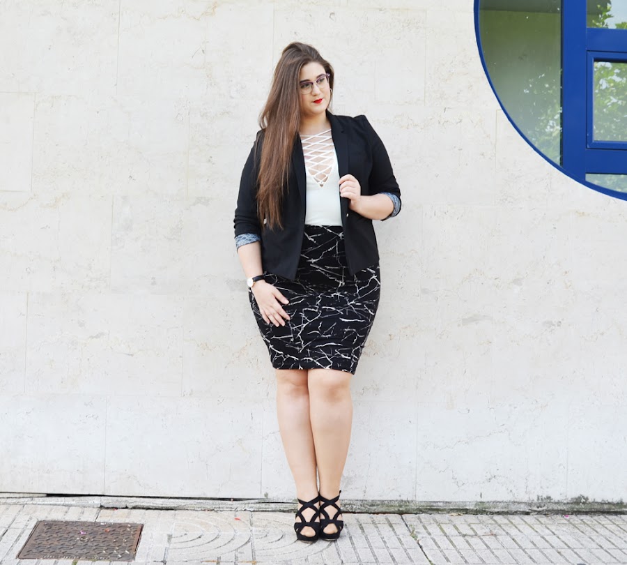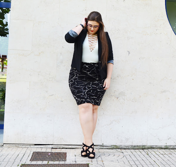 Por otro lado, desde hace un tiempo hacia aquí, hemos estado viendo como los bodys se han ido poniendo cada vez mas y mas de moda. Así como la tendencia de los cordones atravesando el escote. ¡Me super encanta esta tendencia! Así que, ambas juntas... bueno, digamos que no pude resistirme a ello. Así que en esta ocasión, he querido combinar este hermoso body blanco con cordones, con esta falda de tubo estampada. Da la sensación de que hemos cogido un esmalte de uñas y simplemente lo hemos ido salpicando por la falda. Y el efecto que queda, me fascina. Hace de una falda normal y corriente, algo un poco mas especial.