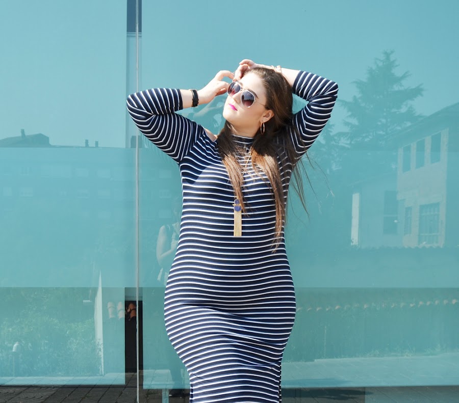 Y de ahí, de esos días, es de los que viene este outfit. Obviamente, la joya de la corona, como siempre digo, es este hermoso vestido de rayas, predominantemente en tonos azules. Como veis, podemos seguir viendo las aberturas de los hombros, en prendas mas otoñales, o invernales incluso. Y reconozco que eso es algo que me ha apasionado ver. Ya que ha sido sin duda una de mis tendencias favoritas durante esta ultima primavera/verano.