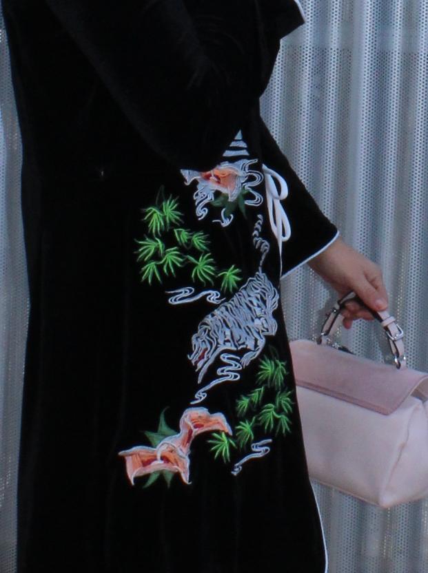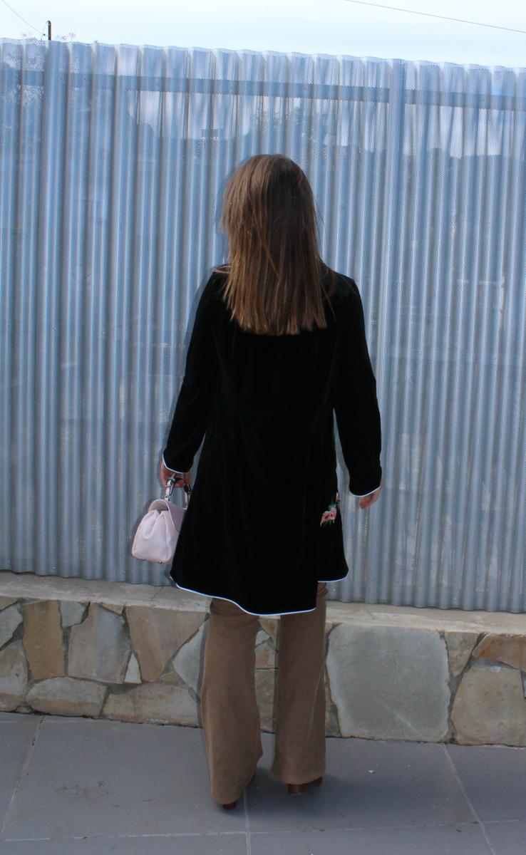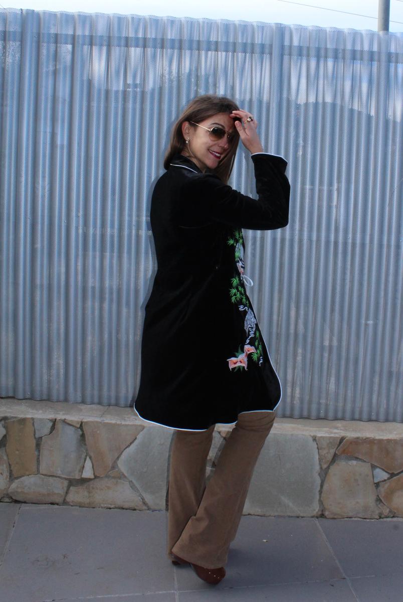 En mi look de hoy he elegido uno de la marca SHEIN, de terciopelo en negro, con el lateral derecho completamente bordado, ribete en color blanco bordeando tanto en los puños como todo el perímetro de la prenda a juego con el lazo que lleva para atar y cuello mao abierto, lo que al cerrarlo deja a la vista un bonito escote.