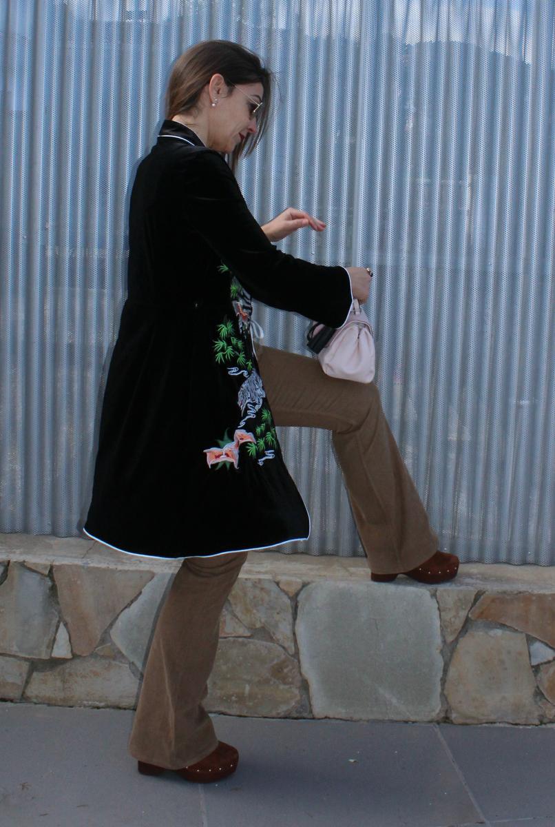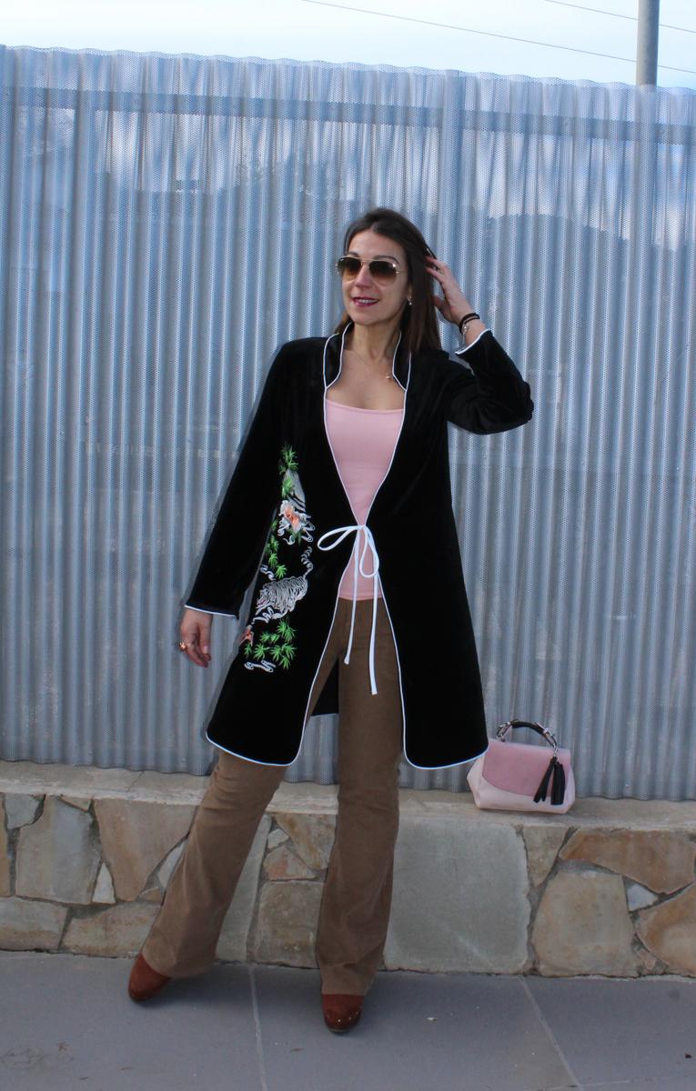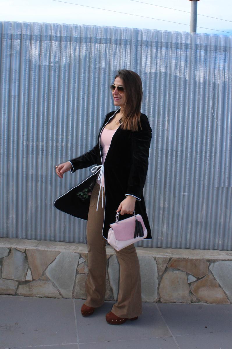 En esta ocasión elegí para combinarlo pantalones de campana de pana en tono marrón y camiseta en rosa palo jugando un poco con los colores de los bordados y con el bolso. En los pies botas con plataforma para ganar unos centímetros y así aumentar visualmente la pierna.
