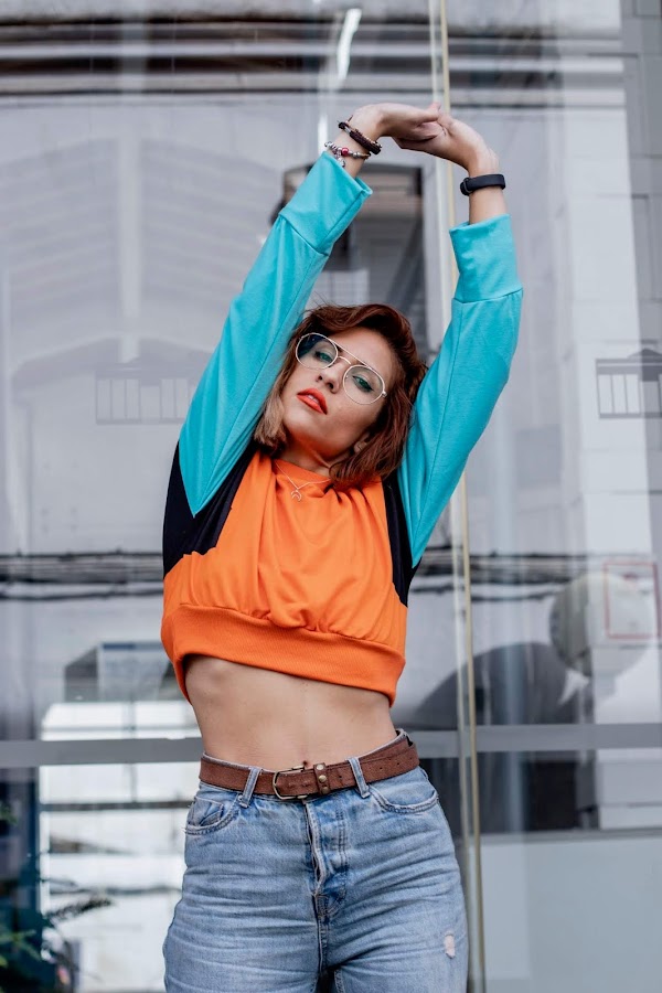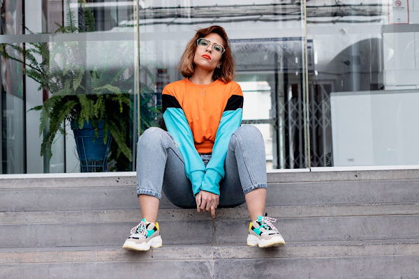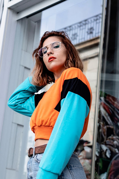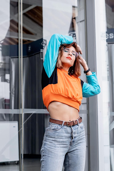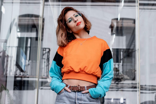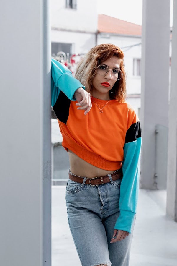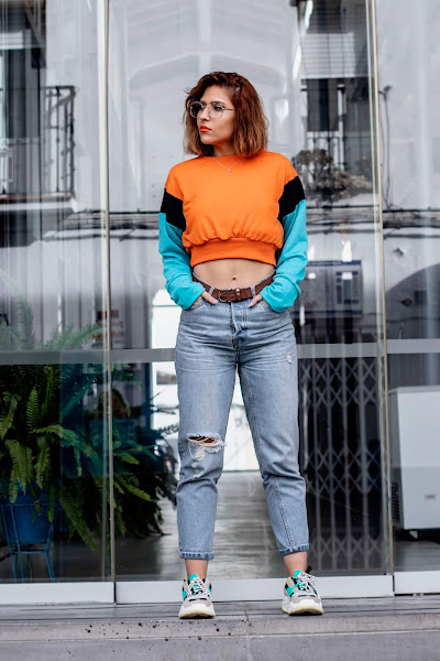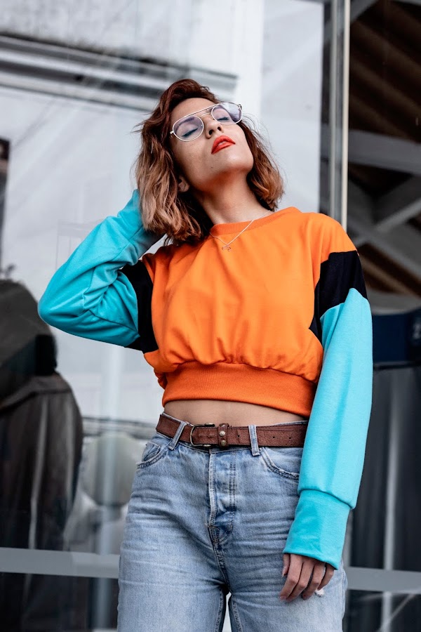 Y bueno, voy al look que os enseño hoy! Si, soy super fan de las sudaderas y tengo miles. Nunca me canso de ellas. La que os enseño hoy es de SHEIN y tiene un toque vintage que me recuerdan un poco a las sudaderas que se llevaban en los 90s. De corte crop y combinando un color naranja muy vivo con un color azul claro y negro en las mangas.