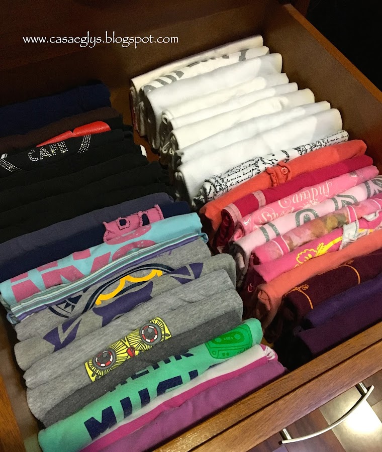 Y así es como quedan en los cajones o gavetas. De un solo vistazo puedes saber que camisetas tienes disponibles y los colores.