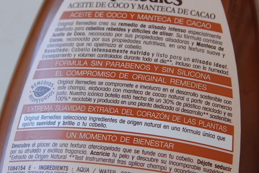Se trata de un champú sin siliconas,con ingredientes de origen natural como son el aceite de coco que ayuda al alisado del cabello,y, con manteca de cacao que aporta propiedades nutritivas.