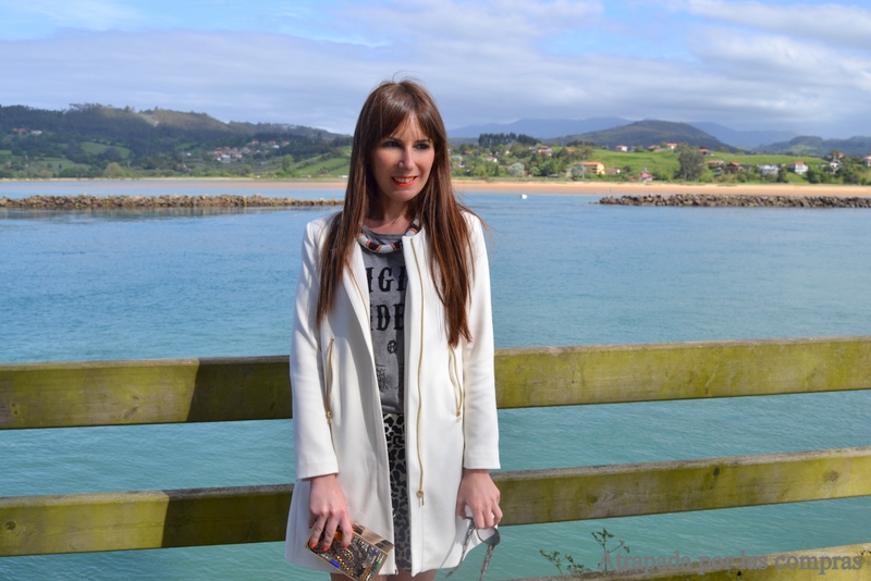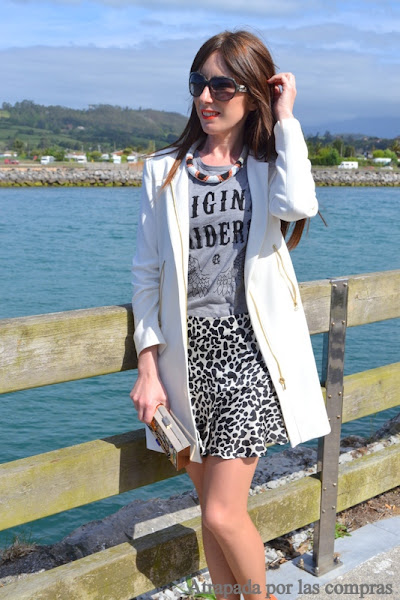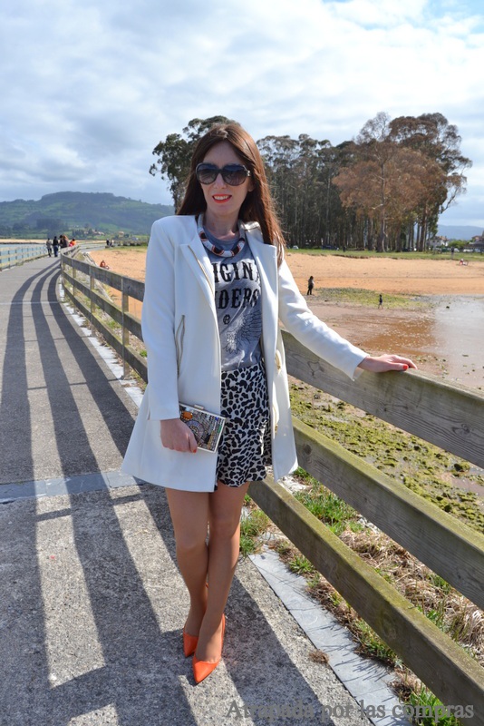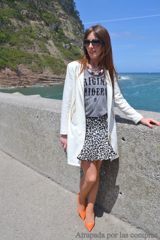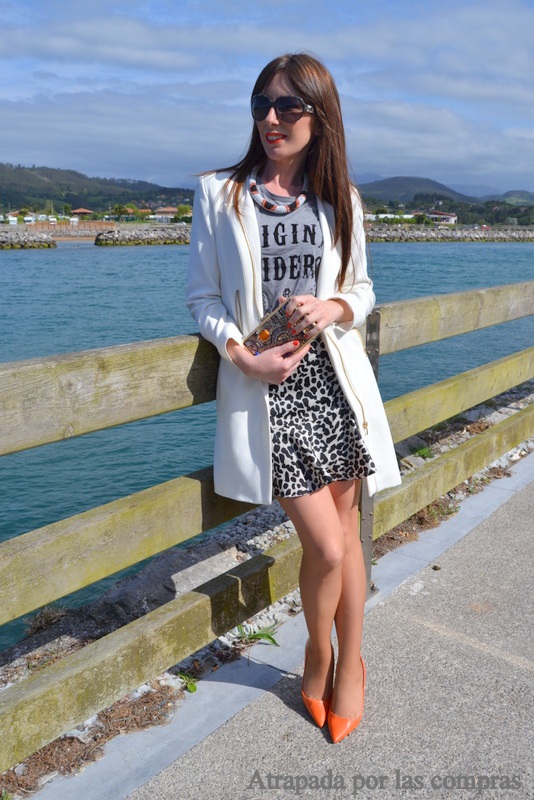 En cuanto al look, hoy os enseño una forma distinta de combinar una falda animal print, normalmente estas faldas de estampado similar al estampado cebra las combinamos con negro o blanco, en esta ocasión me apeteció darle una aire distinto y opté por combinarla con una camiseta gris con un punto rockero y meterle un abrigo de verano blanco que le diera luz al look. Para los complementos escogí un tono vibrante y que destacara, el naranja, esta primavera viene pisando fuerte y con el blanco y negro queda espectacular, así que no lo dudé y me calcé los zapatos naranjas que compré en las rebajas y que me da que esta primavera no voy a apear. Qué os parece el look?