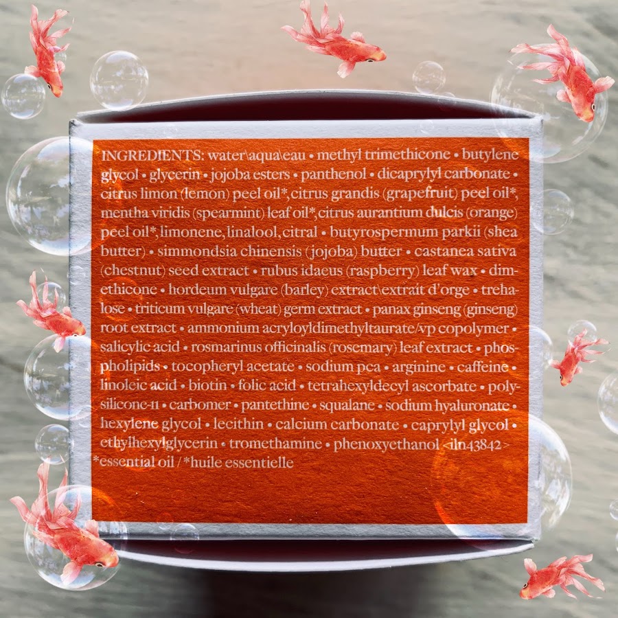 Water\aqua\eau, butylene glycol, dicaprylyl carbonate, silica, glycerin, niacinamide, isopropyl isostearate, citrus limon (lemon) peel oil(1) , citrus grandis (grapefruit) peel oil(1) , mentha viridis (spearmint) leaf oil(1), citrus aurantium dulcis (orange) peel oil(1), limonene, linalool, citral, butyrospermum parkii (shea bu er), simmondsia chinensis ( jojoba) bu er, hydroxyethyl urea, hordeum vulgare (barley) extract\extrait dorge, trehalose, cucumis sativus (cucumber) fruit extract, panax ginseng(ginseng) root extract, sodium polyaspartate, tocopheryl acetate, sodium pca, helianthus annuus (sunflower) seedcake, sorbitol, ca eine, linoleic acid, ophiopogon japonicus root extract, squalane, sodium hyaluronate, ppg-15 stearyl ether, ammonium acryloyldimethyltaurate/vp copolymer, hydroxyacetophenone, carbomer, caprylyl glycol, xanthan gum, sodium hydroxide, ethylhexylglycerin, disodium edta, phenoxyethanol.