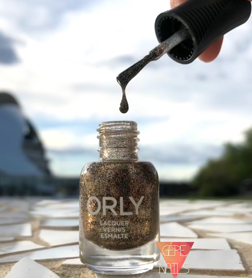 El siguiente del que os hablo es un esmalte semi transparente (con un toque ligeramente negro), con muuucho glitter negro y dorado. Para ser sinceros, viéndolo en el pack, fue el que menos me gustó, ¡pero puesto fue el que más! MUY brillante. Enserio, altamente brillante, ideal para destacar de día y de noche.