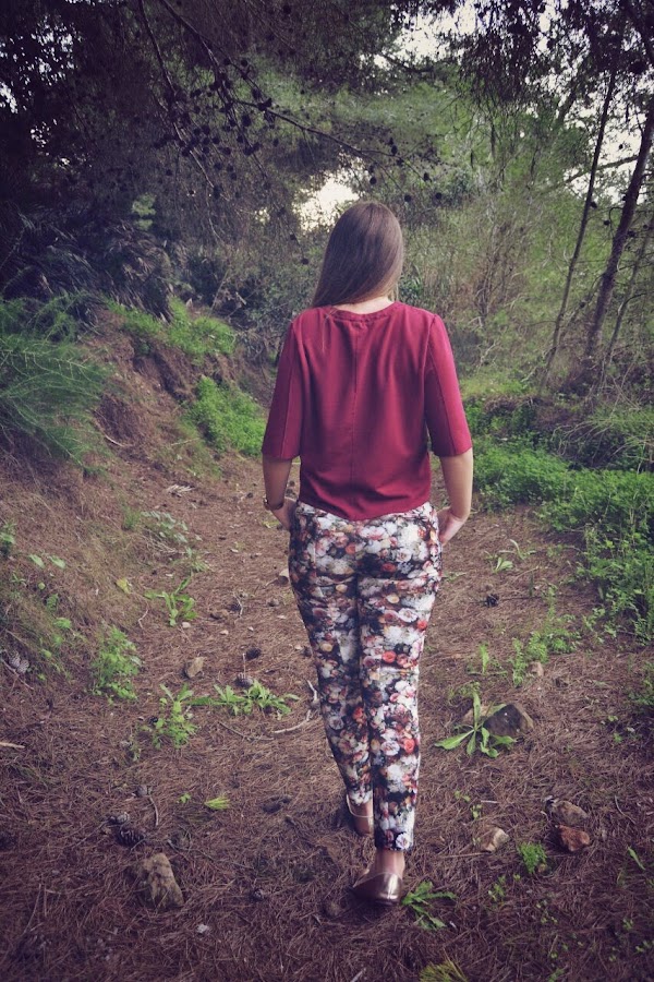 Hoy os enseño un outfit otoñal perfecto para cualquier día. Consta de un top color burdeos y un pantalón ajustado con print flora. Además, acompaña unas zapatillas color doradas metalizadas y un cinturón negro.