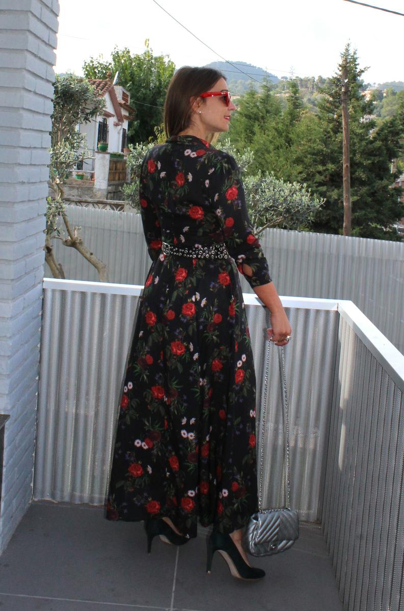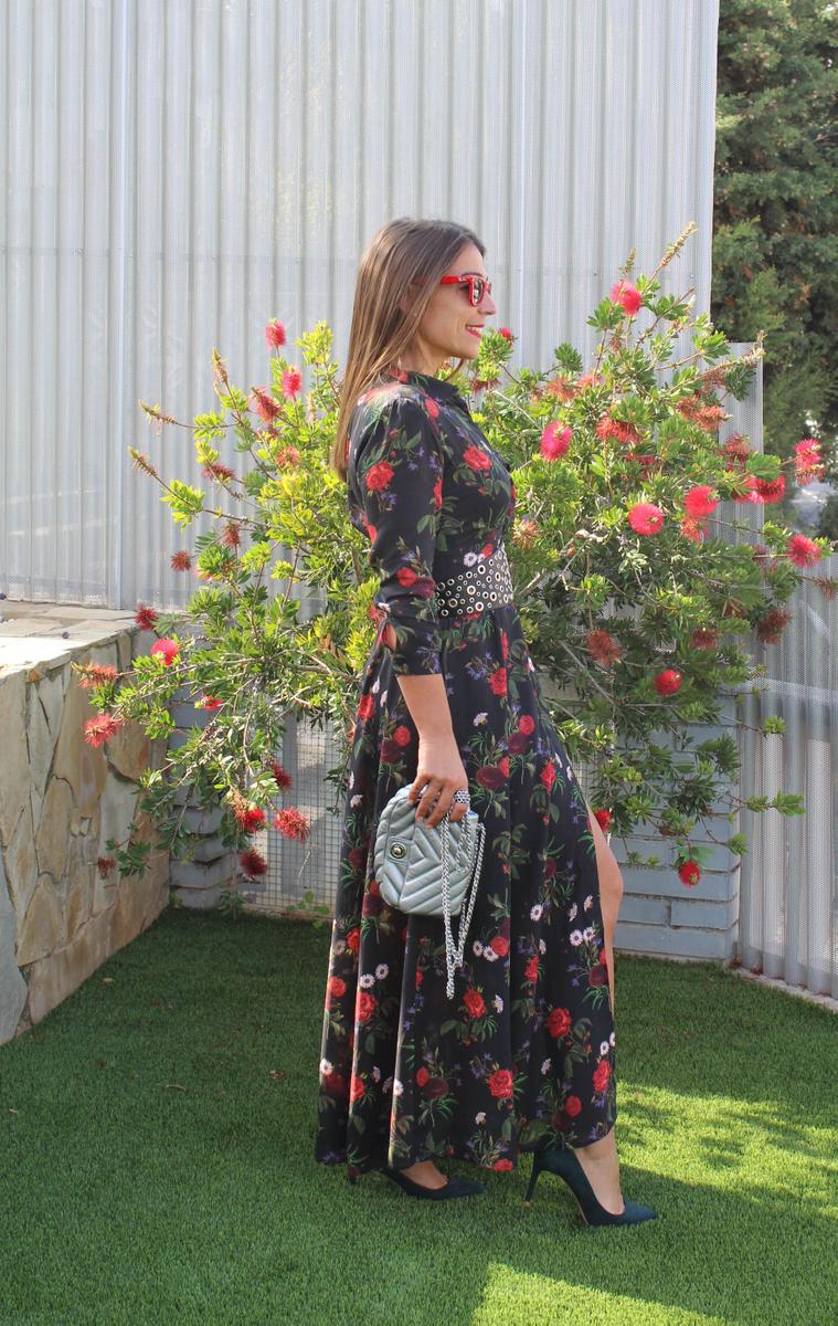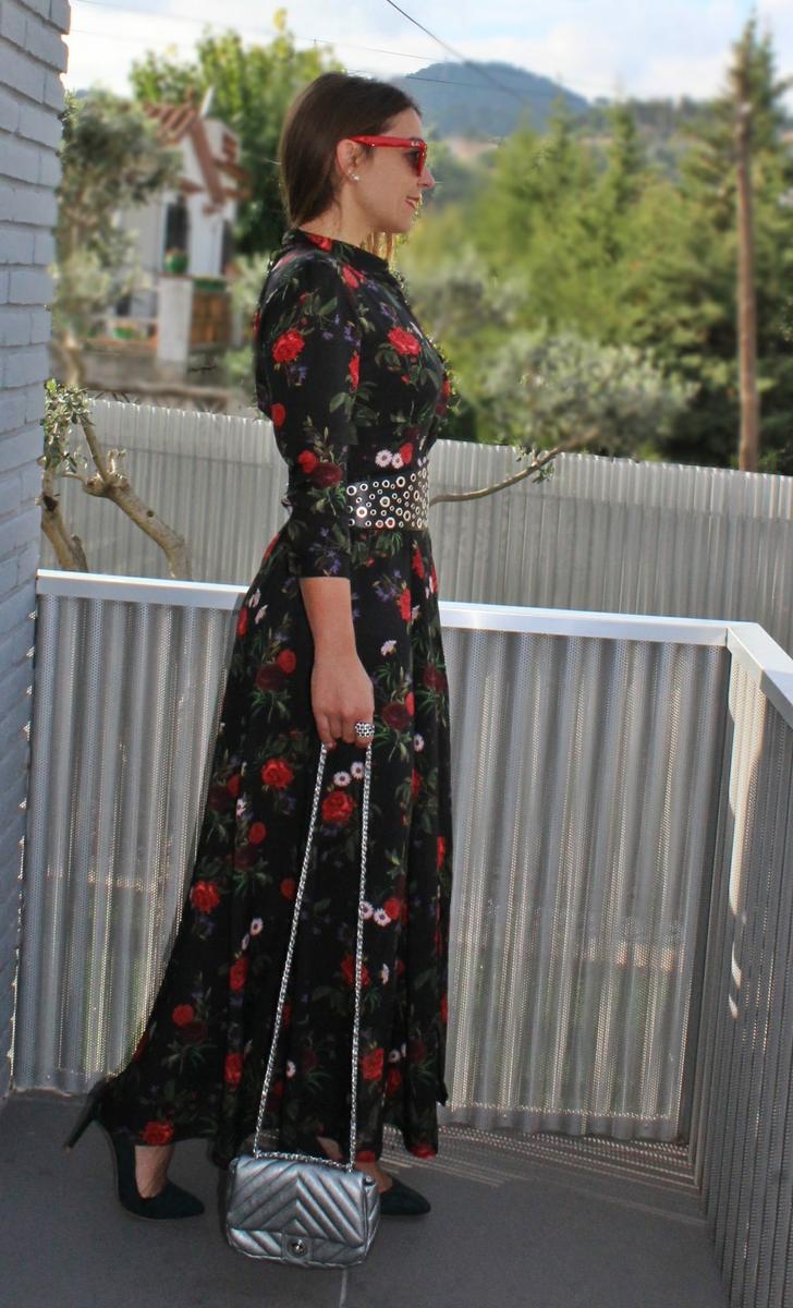 Como complementos opté por un fajín de piel adornado con arandelas metálicas, bolso plateado y en este caso salones de color verde.