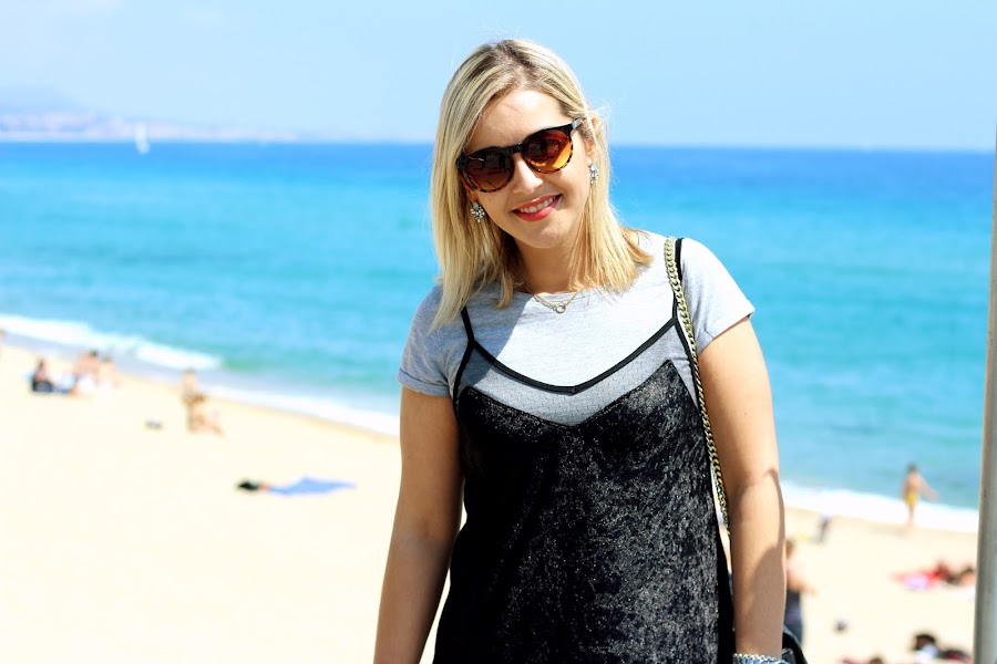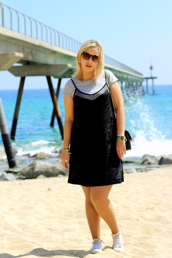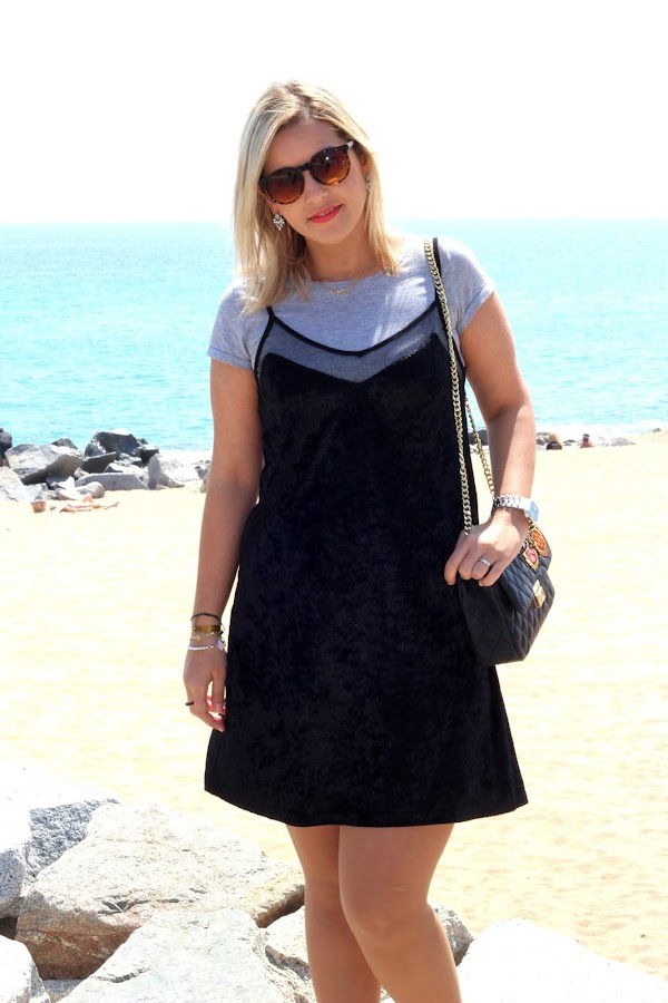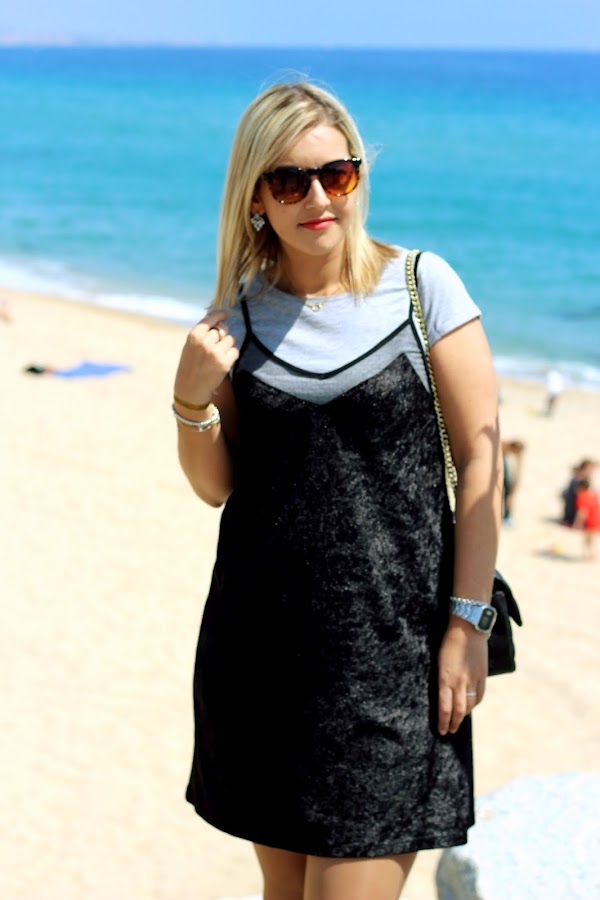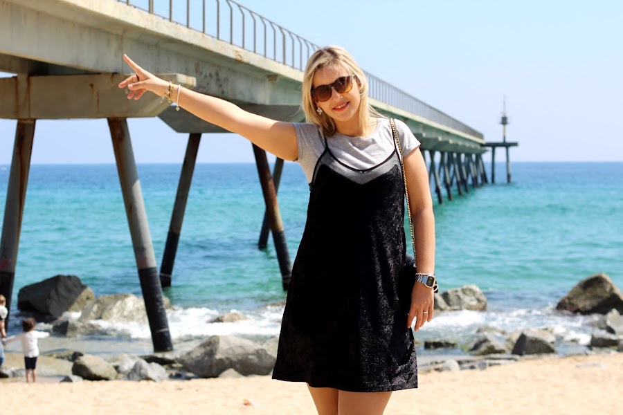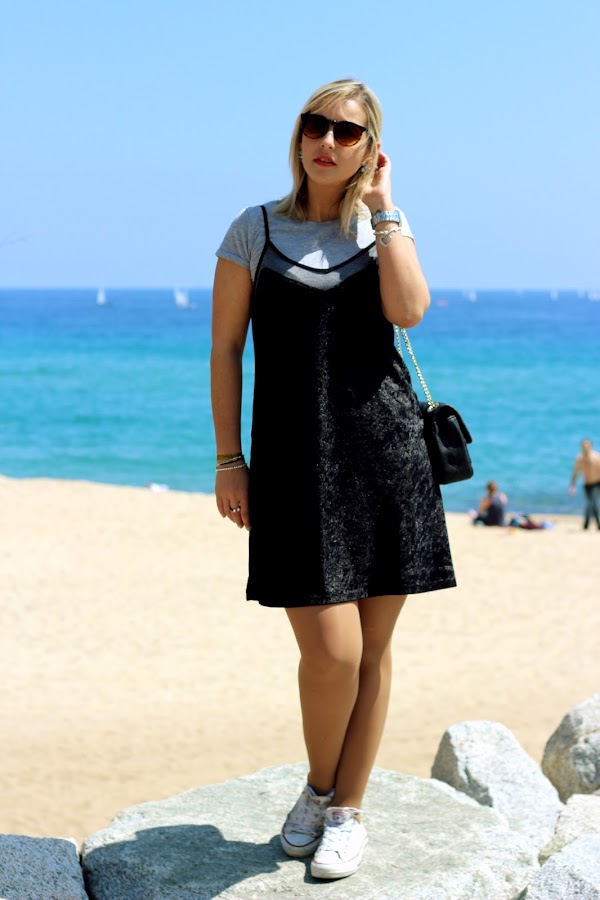 Aprovechando el buen tiempo que hacía en Semana Santa, nos fuimos a pasear por la playa. Para la ocasión, escogí un look casual con un vestido tipo lencero de terciopelo al que le añadí una camiseta gris de manga corta que me puse por debajo, mis inseparables Converse y mi bolso de parches de Zara. Por si la brisa del mar me hacía pasar frío, le añadí una chaqueta larga de punto.