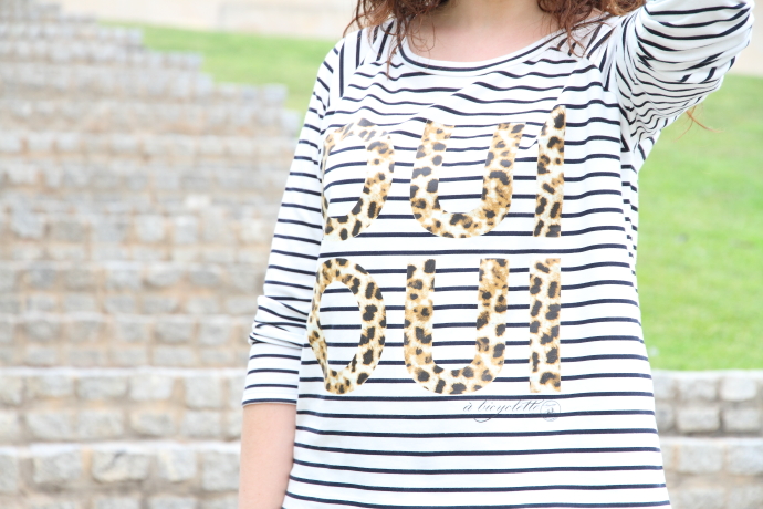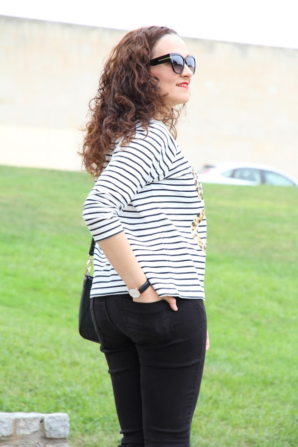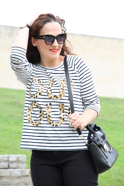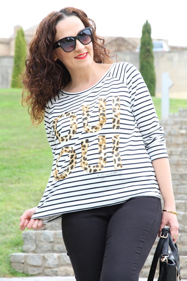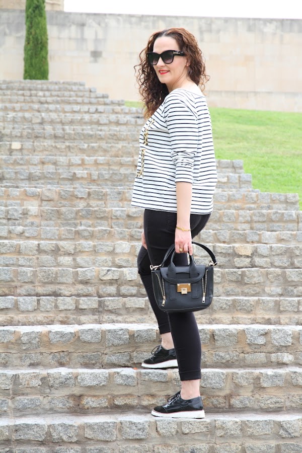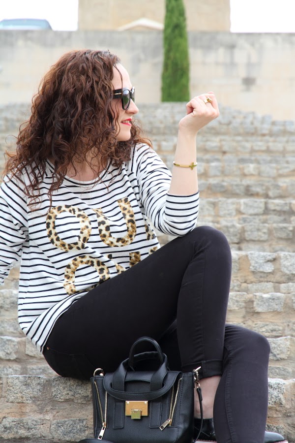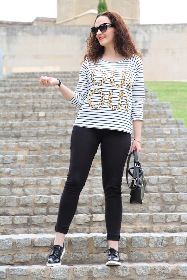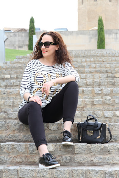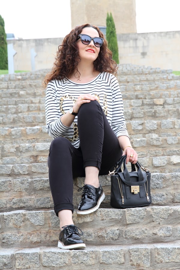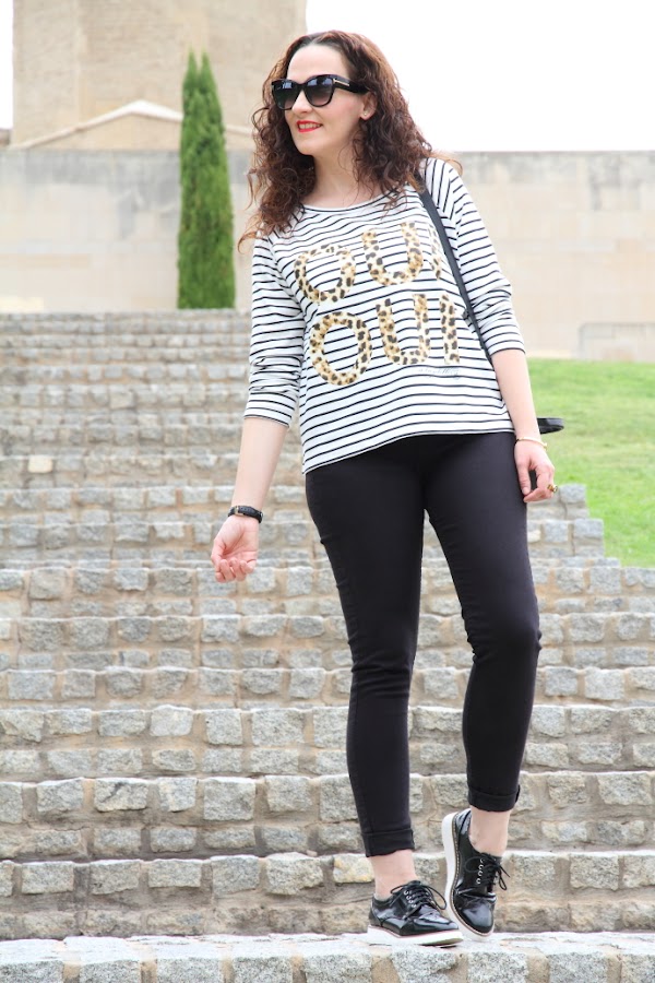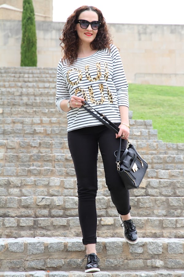 La primera vez que vi esta sudadera me enamoré de ella pero no me la pude comprar porque se agotó enseguida. A principio de esta temporada vi que la habían vuelto a reponer pero esta vez fui más rápida y no me quedé sin ella. El combo de las rayas con el animal print me chifla y además me gusta tanto que le veo múltiples posibilidades, como con falda en un look lady que pronto ensañaré. Hoy os muestro como la llevé hace un par de domingos para disfrutar de una mañana viendo DH urbano. Me decanté por llevarla en un outfit mucho más casual con pantalones pitillo negros y mis nuevos zapatos masculinos. Tenía muchas ganas de unos zapatos así y desde que me los compré me tienen loquita, además por lo que vi en vuestros comentarios cuando os los enseñé en Ig también os conquistaron.