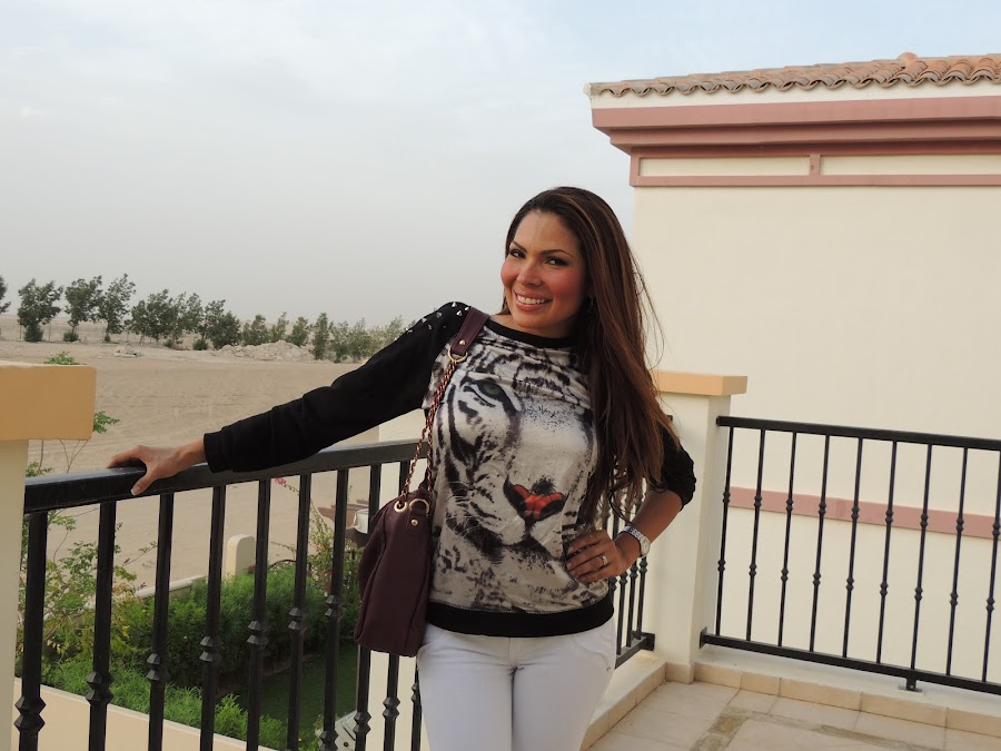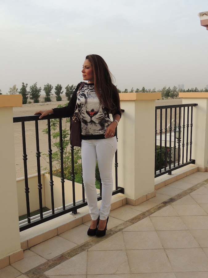 La primera fue este hermoso sueter con un motivo de tigre con taches en los hombros que me encanto...Lo combinamos con un pantalon blanco, unos zapatos negros con tachecitos y un bolso de color vino para combinarlo con la naricita del tigre