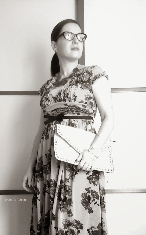 Los complementos los he escogido en tonos claros por el calor que hacía aún el domingo, pero con marrones oscuros quedaría fenomenal. Las gafas acompañan el aire retro del vestido, y las sandalias de cuña realzan las piernas (una pequeña ayuda visual para las que somos bajitas e hiper-blancas, jaja).