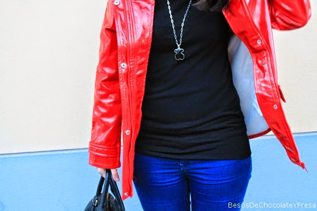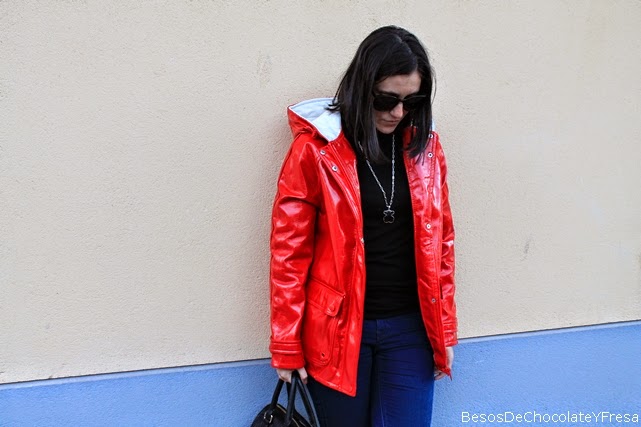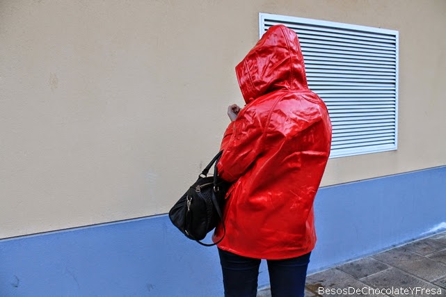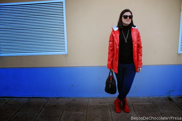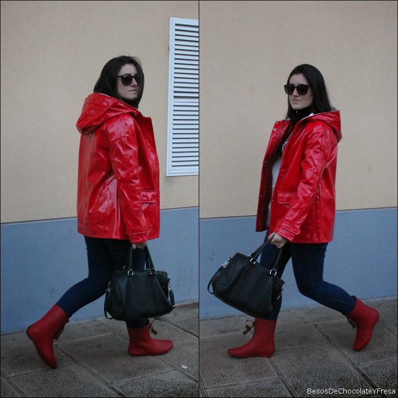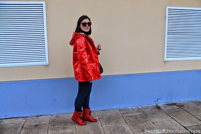 Hoy os muestro un look apto para un día totalmente lluvioso, como ha ocurrido toda esta semana pasada. (Está claro que cuando empieza a llover por aquí en el norte no para...). Llevo mi nuevo chubasquero a lo caperucita roja con jeans, sweater negro y botas de agua del mismo color. Como complementos bolso tote en negro.