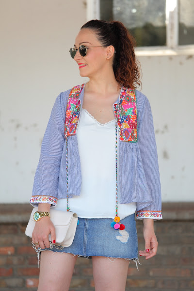 Me encantan los look veraniegos muy coloridos porque me transmiten alegría. Por eso, cuando hace unos días me llegaron mis nuevas Adidas Gazelle rosas enseguida me las imaginé en un mix con esta preciosa chaqueta bordada de pompones. La chaqueta la cogí en Zaful porque es exactamente igual a la que Zara sacó este verano y que quería si o si, pero que por mucho que busqué no encontré en tienda. Lo mejor es que la chaqueta está confeccionada genial y me resultó más barata. Para este día le añadí mi falda tejana favorita y un mini bolso bandolera. De nuevo un look sporty sencillo pero con toques chics como a mi me gustan.