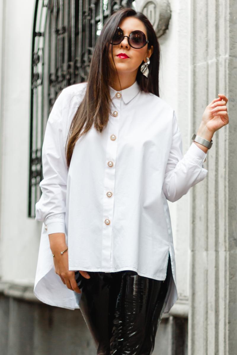 Los pantalones negros plastificados son una prenda demasiado flashy, llaman demasiado la atención, así que quise combinarlos con una camisa blanca oversized para que los pantalones fueran los protagonistas. Más adelante te voy a dejar más ideas de cómo combinar unos pantalones negros plastificados, así que te invito a seguir leyendo.