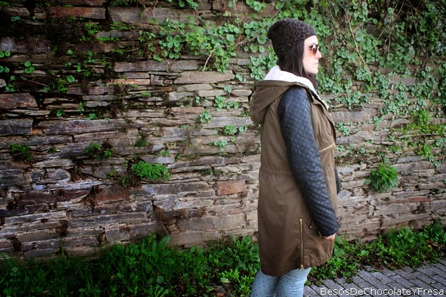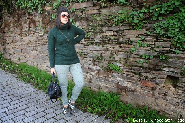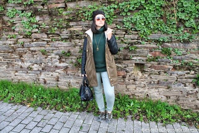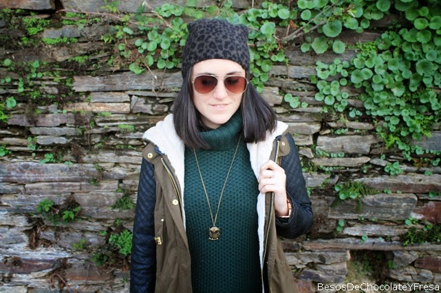 For this occasion I chose a comfortable look composed topos green jeans, bottle green sweater turtleneck super loving, parka with leatherette sleeves and green and white sneakers. As necklace and bracelet complements owls and tote bag in black and hat with touches of animal print.