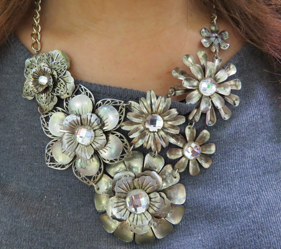 El collar de flores XL en color plata a juego con el reloj. Llevo una mini cartera con cadena en color gris metálico; y el toque de color las bailarinas en color rosa con puntera en color gris.