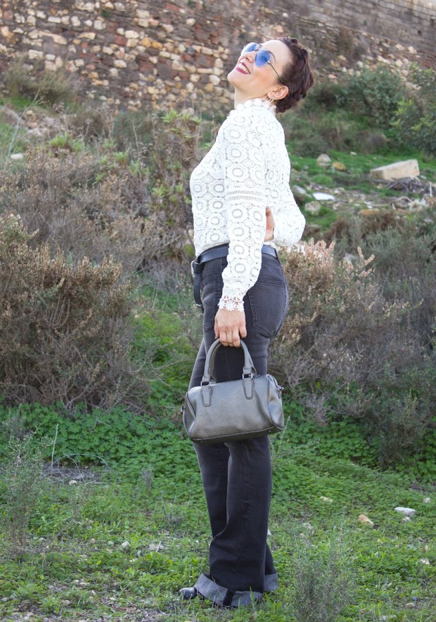 Este look, como podéis ver tiene elementos especiales que lo hacen ser casual pero arreglado: peinado con corona de trenzas, una preciosa blusa de encaje (aquí), unas gafas aviador en color azul, una biker azul bordada muy especial (aquí) y unos jeans acampanados. Es decir, detalles que suman un look pensado para arreglarte pero a la vez ir y cómodo, ideal para empezar por un café y terminar cuando quieras!!