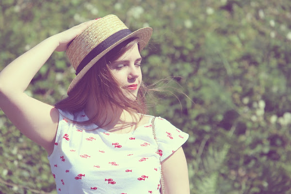 Cámara en mano y con mi hermana como modelo nos fuimos muy cerquita de casa a fotografiar este look protagonizado por una camiseta handmade que tiene un estampado que enamora o, al menos, ese fue el sentimiento que despertó en mí cuando vi la tela. Esos pececillos bordados en color rojo (mi favorito) sobre algodón blanco hicieron que no me resistiera a confeccionar algo con este tejido que se ha convertido en un básico de cada primavera/verano en mi armario.