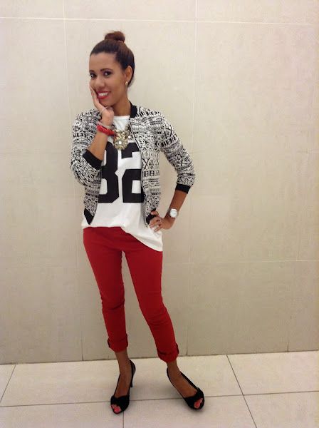 Utilicé un bomber de la marca Shana en estampado blanco con negro, y un súeter con gráfico, lo complementé con un pantalón en color rojo para animar el look. El collar lo amo...es de flores metalizadas, llama mucho la atención, siento que es el toque chic del outfit.
