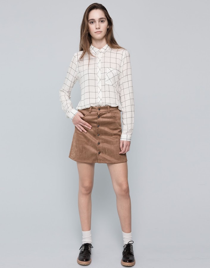 El tipo de falda que va a estar más de moda es la corta con línea tipo A, y con algún detalle como botones o cremallera. Esta con tejido de antelina que os presentamos la encontráis en Pull&Bear.
