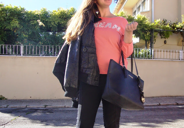 Como el frío todavía no acaba de llegar, hemos elegido una cazadora negra muy sencilla. Pero si el frío aprieta, este look también queda fenomenal con un buen abrigo :).