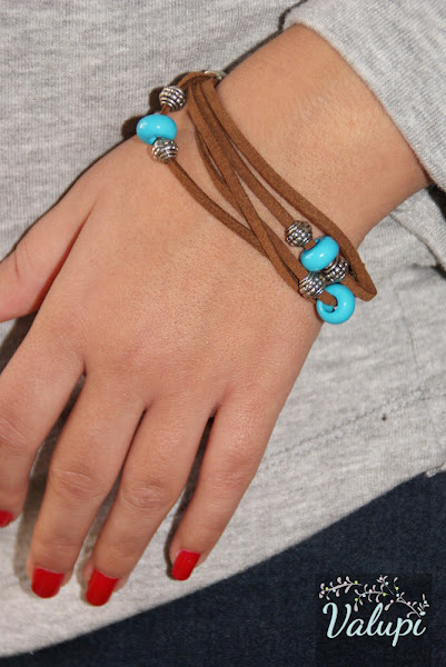 Combinando con los complementos, he escogido esta pulsera de Valupi con antelina marrón y charms plateados y azules.