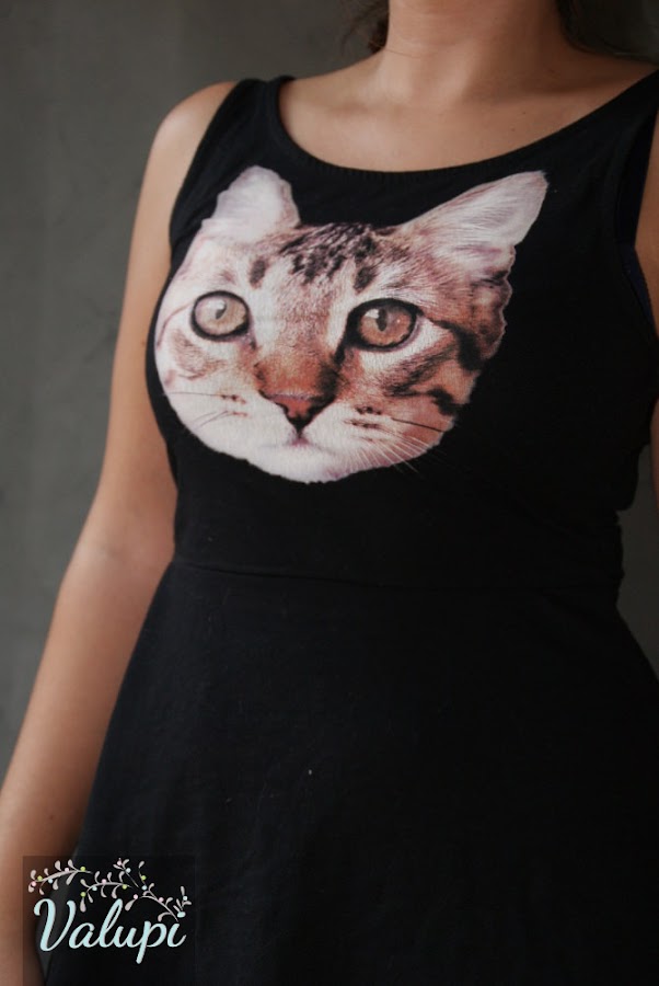 El vestido negro con el estampado de la cara de un gato nos enamoró al segundo de verlo (además, es igual que uno de nuestros gatos). Con la falda tipo skater nos quedará genial para cualquier momento del día.