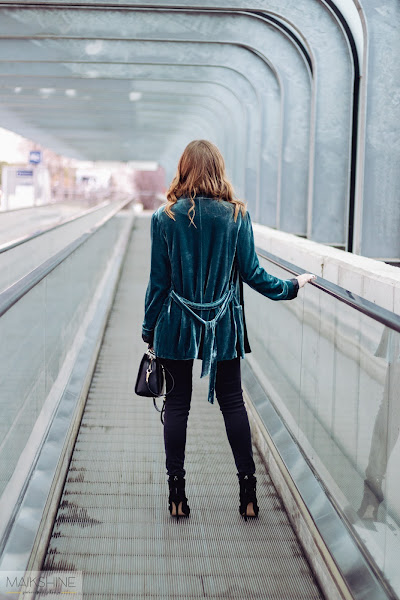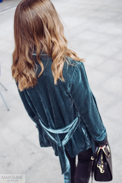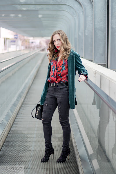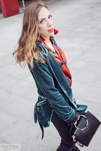 Las prendas que escogí para darle ese toque más elegante al outfit, fueron este body de seda de estampado floral y mi blazer de terciopelo verde cuyo color me tiene enamorada. La mezcla de estas texturas le aportan sofisticación al look, pero al mismo tiempo la blazer tipo batín tiene una caída que le resta sobriedad, encajando perfectamente con lo que buscaba: un toque chic, pero juvenil.