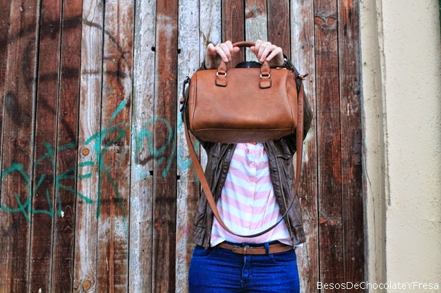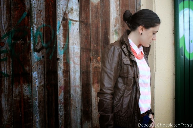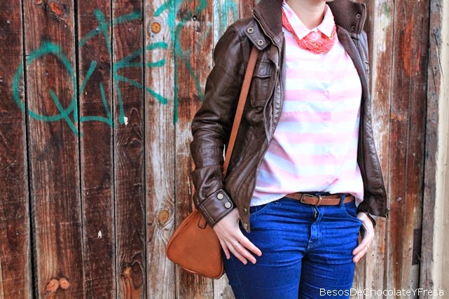 Llevo biker de cuero marrón con camisa de rayas rosa, jeans básicos y mis nuevos botines en marrón. Como complementos collar entrenzado, cinturón y bolso tote en marrón.
