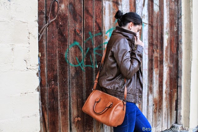 Wear brown leather biker jacket with pink stripes, basic jeans and my new boots in brown. As supplements entrenzado necklace, belt and brown tote bag.