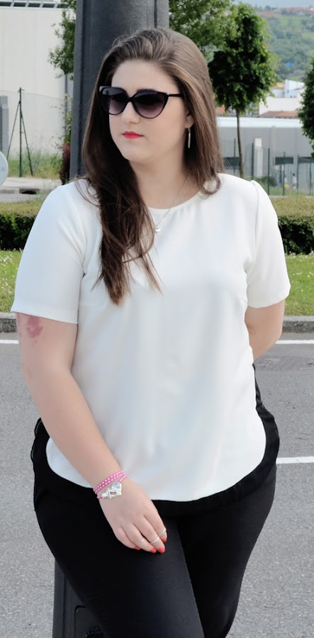 El motivo por el que me gusta tanto esta blusa, a parte de lo obvio de la parte trasera y esos hermosos lacitos, son las mangas. Se trata de unas mangas cortas, sin embargo en la zona del hombro se abomba muy ligeramente y el conjunto hace que parezca que tenemos menos brazo. Y para las personas como yo, que tenemos un buen brazo (jajaja!) es un plus muy muy grande.