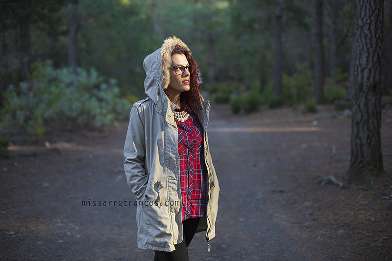 En esta ocasión usé una camisa muy en tendencia como es la de "leñador" en color rojo. Y una parka que tiene pelo en el gorro y combina con los detalles de las botas.