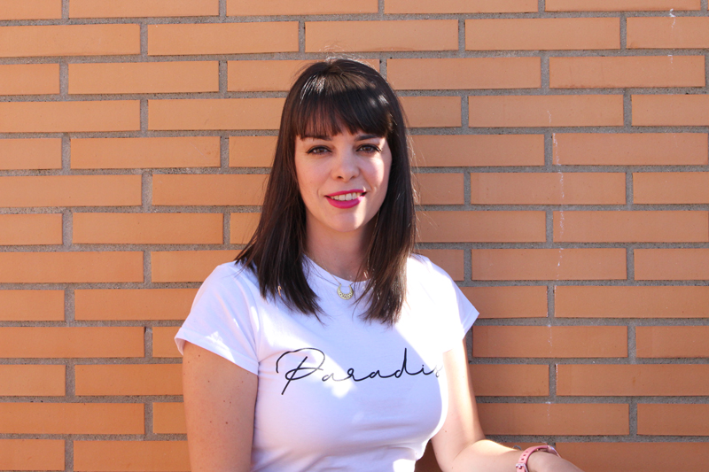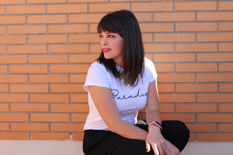 La camiseta es súper básica también pero con la palabra Paradise en ese tipo de letra creo que le da un toque muy chulo, a mi por lo menos me lo parece.