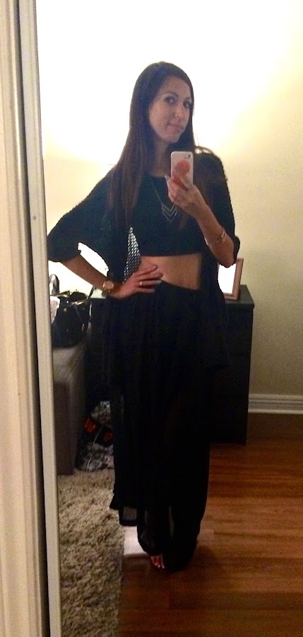 H&M maxi skirt + Outlet crop top + Outlet cardigan + American Eagle triple chevron necklace