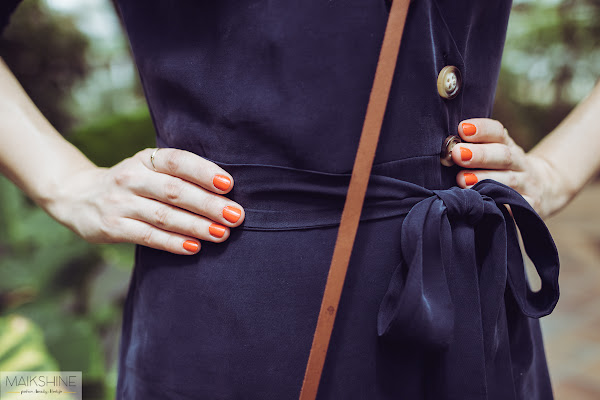 Para ello, quise aportarle un color vibrante y que contrastase muy bien con el azul: el coral. Lo añadí en prácticamente todos los accesorios del look: sandalias, pendientes, pañuelo y maquillaje - labial y uñas -. ¿Qué os parece?